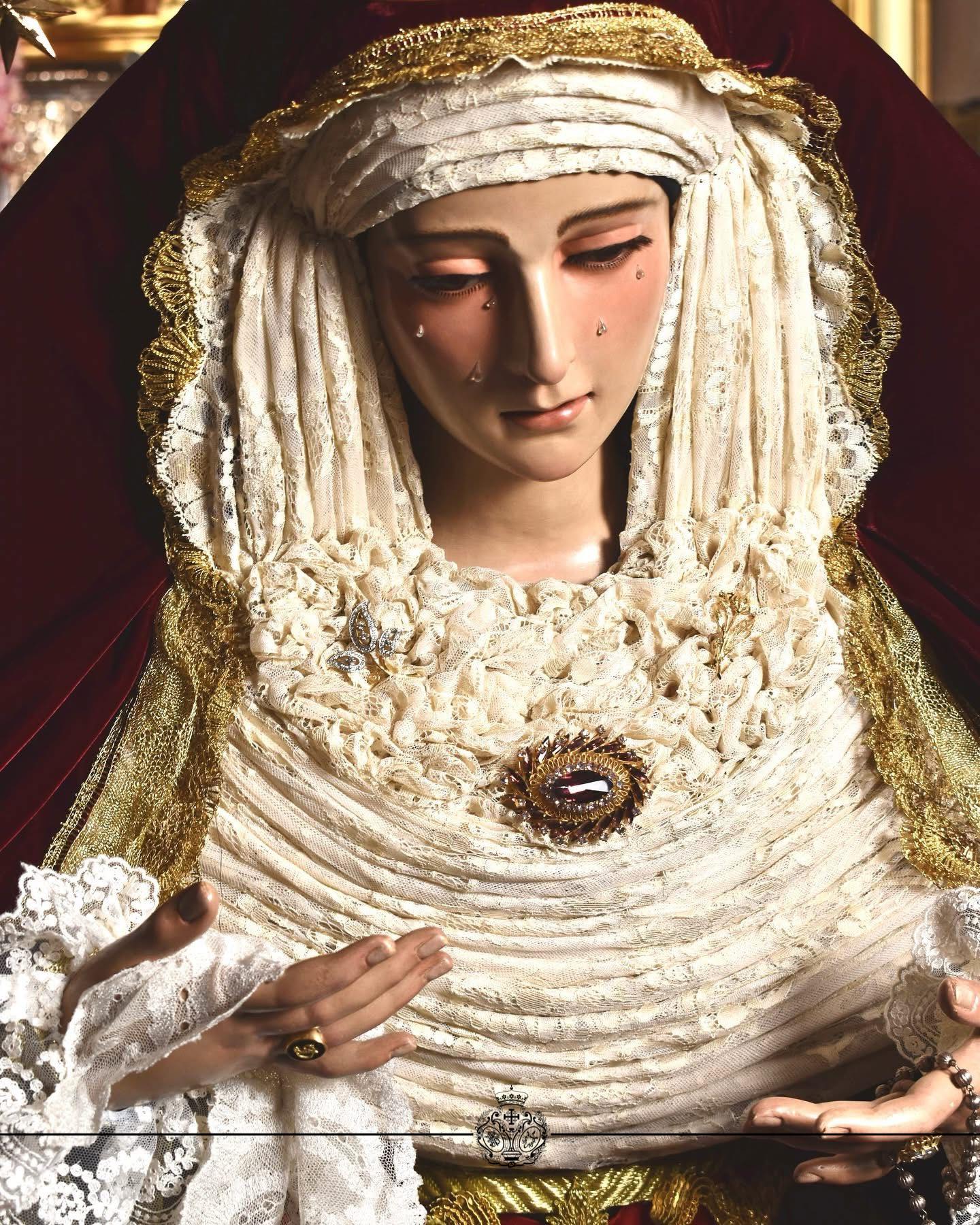 Hábito: Túnica y capillo color morado, capa color blanco y cíngulo dorado en tramo de Cristo. Túnica y capillo verde oscuro, capa color burdeos en tramo de San Juan Evangelista. Túnica y capillo color negro, capa blanca y cíngulo también blanco en tramo de Virgen.