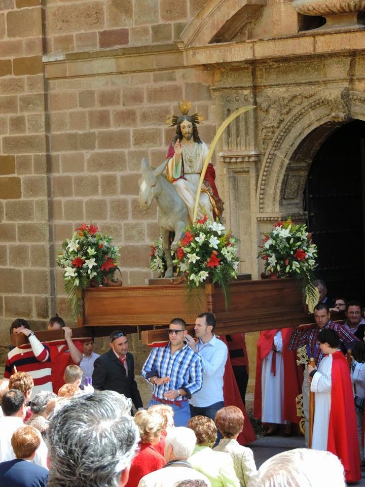 Primero los fieles recogen en la iglesia las palmas y las ramas de olivo, después van hacia el lugar llamado "Nicho". Allí el Sacerdote los bendice y después marchan hacia la parroquia en donde a las doce horas se celebra la Santa Misa. Seguidamente se inicia la procesión llamada de las" palmas", con Jesús, montado en la borrica.