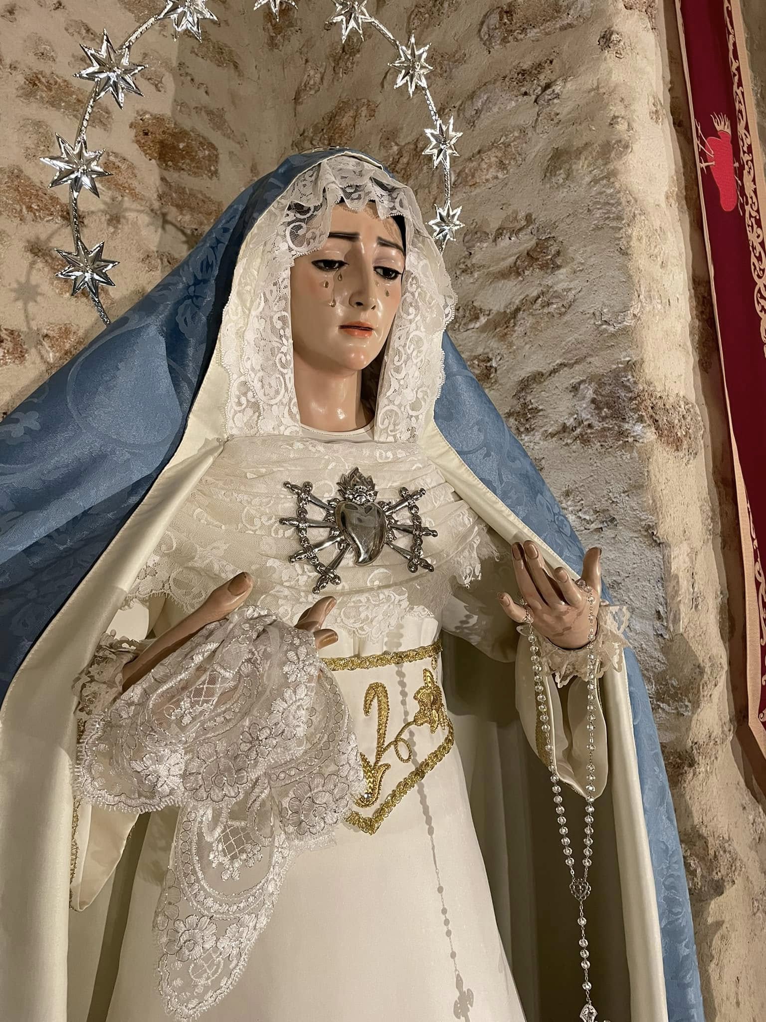 La Cofradía de la Santísima Virgen de los Dolores, tristemente desapareció en el trienio de 1936‐39 por la destrucción de su imagen, vuelve a rehacerse en su segunda época con una nueva imagen réplica de la anterior y cuyo autor se desconoce, donada a la Parroquia por el Sr. Luis Álvarez Ruiz en 1952.