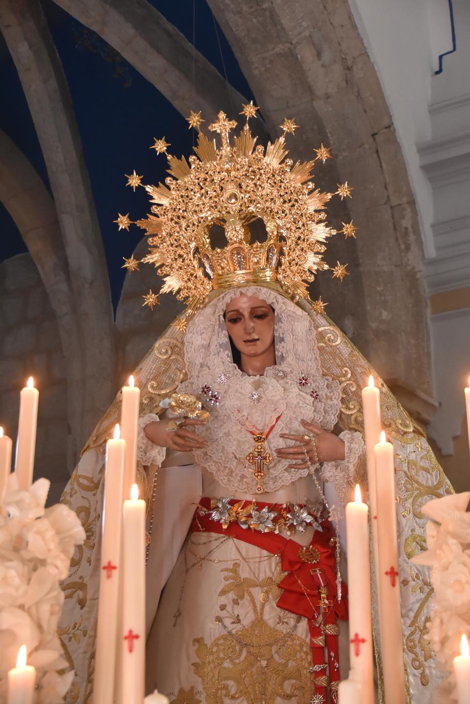 Hábito: Túnicas y capirotes blancos y cíngulo rojo. Además, en la estación de penitencia podemos encontrar a mujeres vestidas de mantilla.