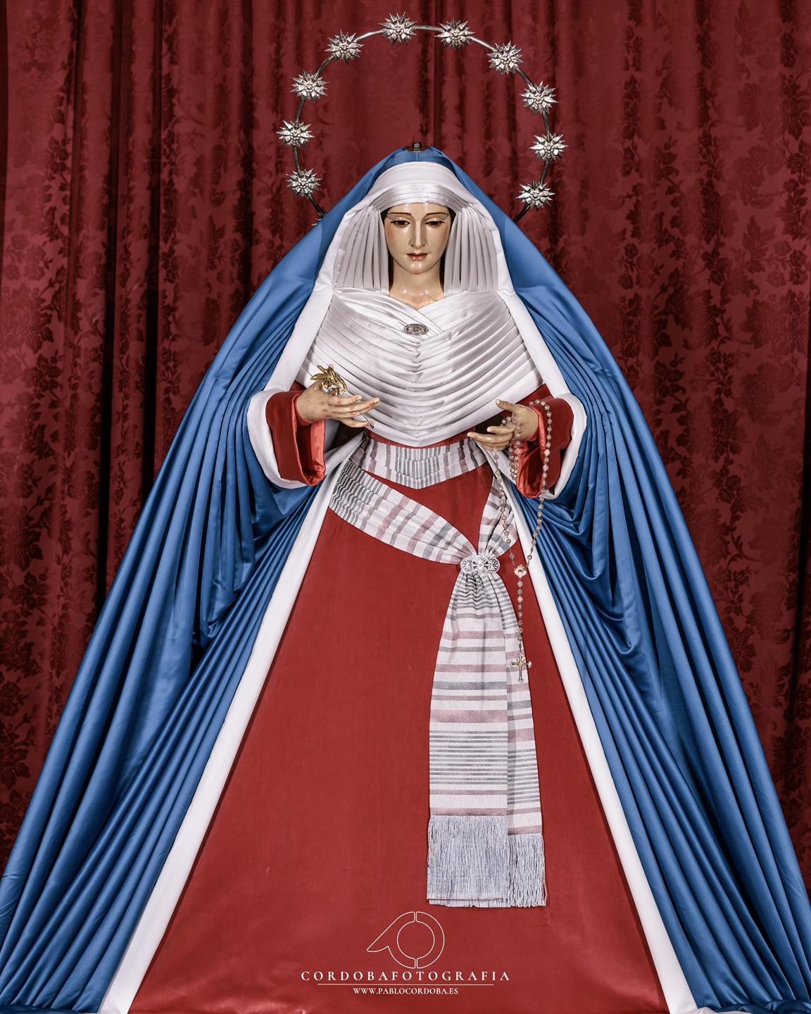 Hábito: Túnicas de color hueso como la capa. El capillo de terciopelo burdeos