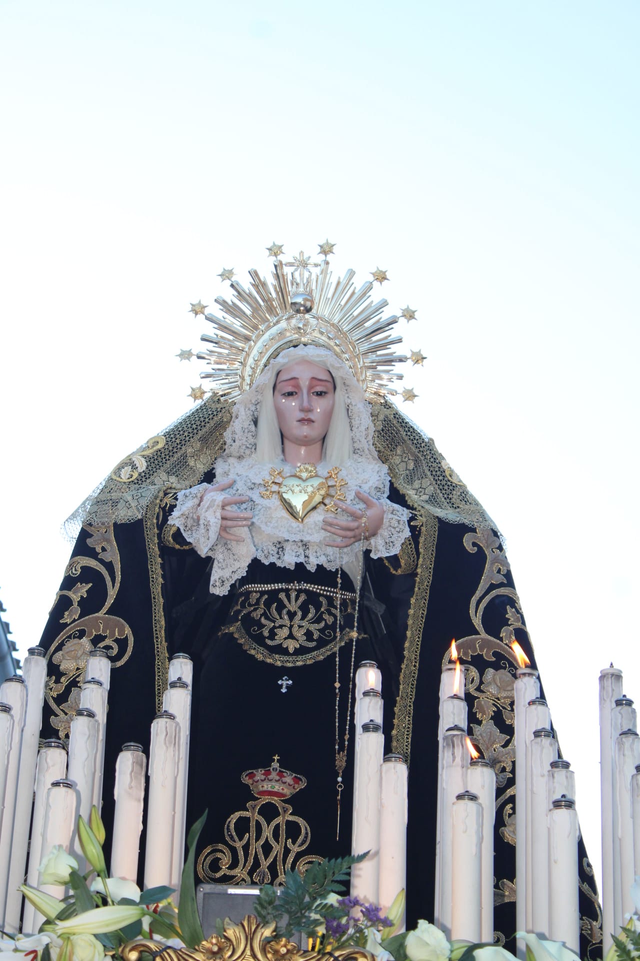 Hábito: Túnica negra, cíngulo negro, capa blanca de raso, capirote blanco en raso y corazón dorado.
