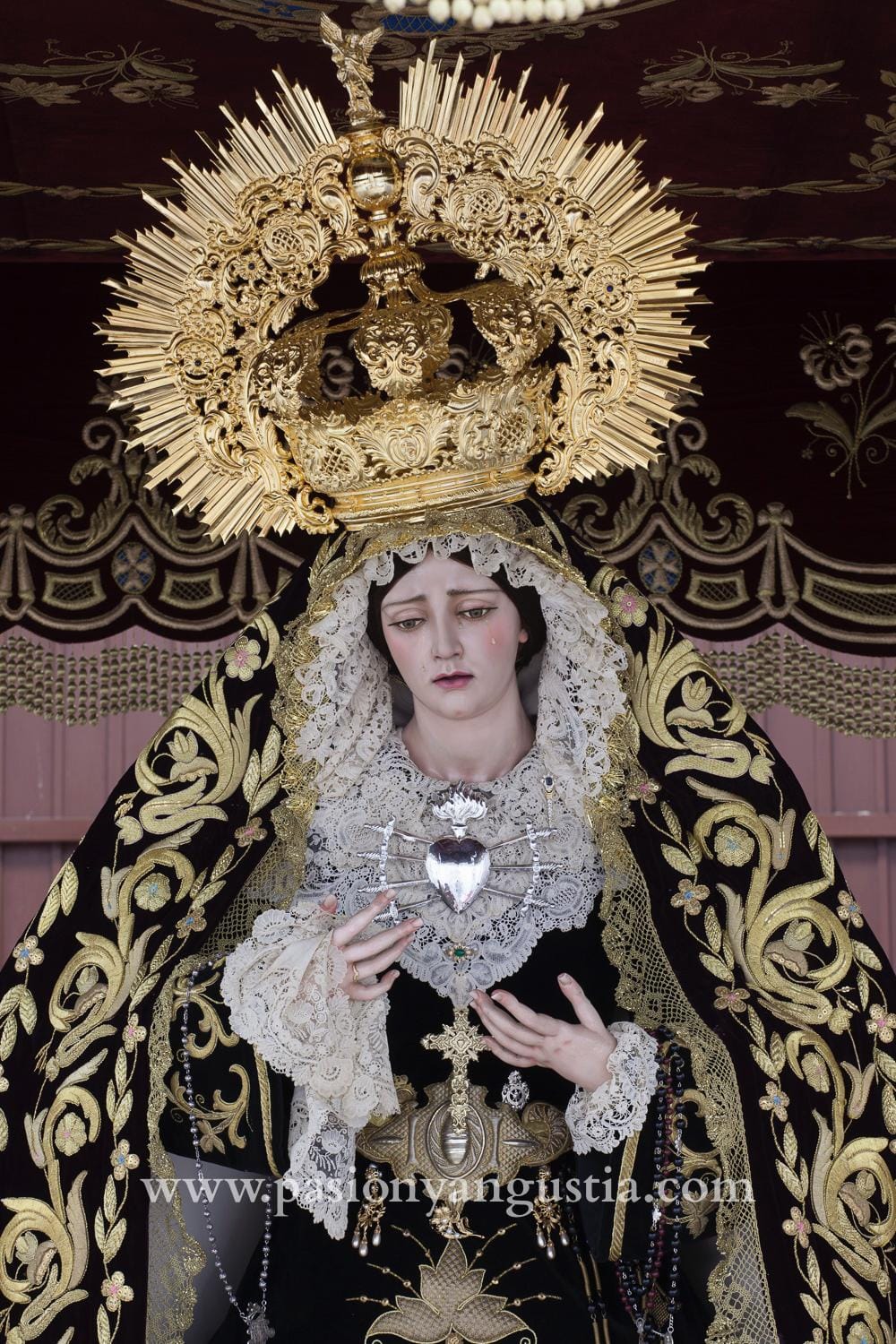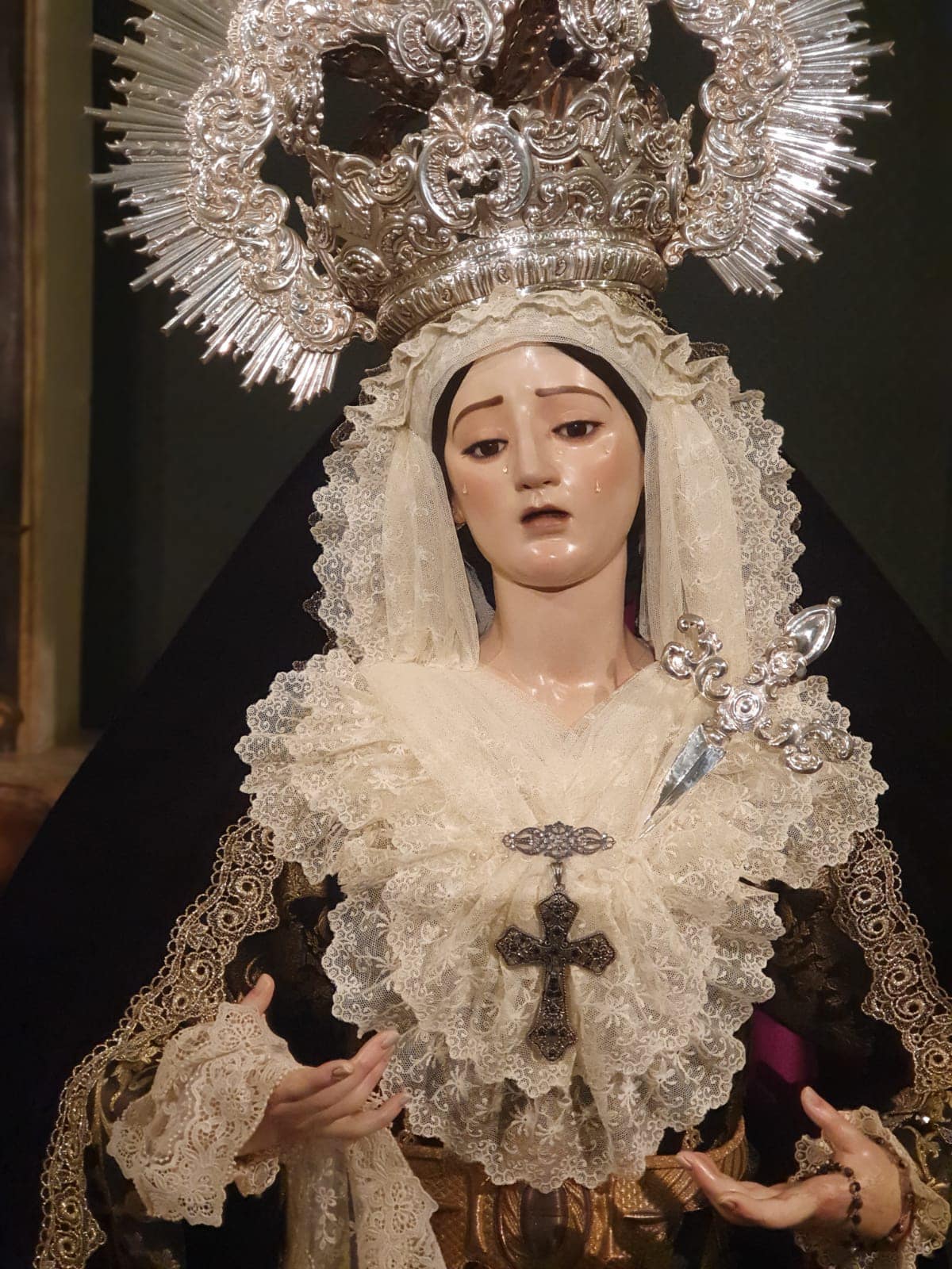 La imagen de Nuestra Señora de las Angustias ha sufrido varias modificaciones desde su origen en barro cocido del siglo XVIII, con nuevas tallas realizadas por Alfonso Gabino y Ramón Chaveli. El paso de la cofradía, de estilo barroco sevillano, fue realizado por Manuel Guzmán Bejarano entre 1969 y 1970 y galardonado con un premio de artesanía.