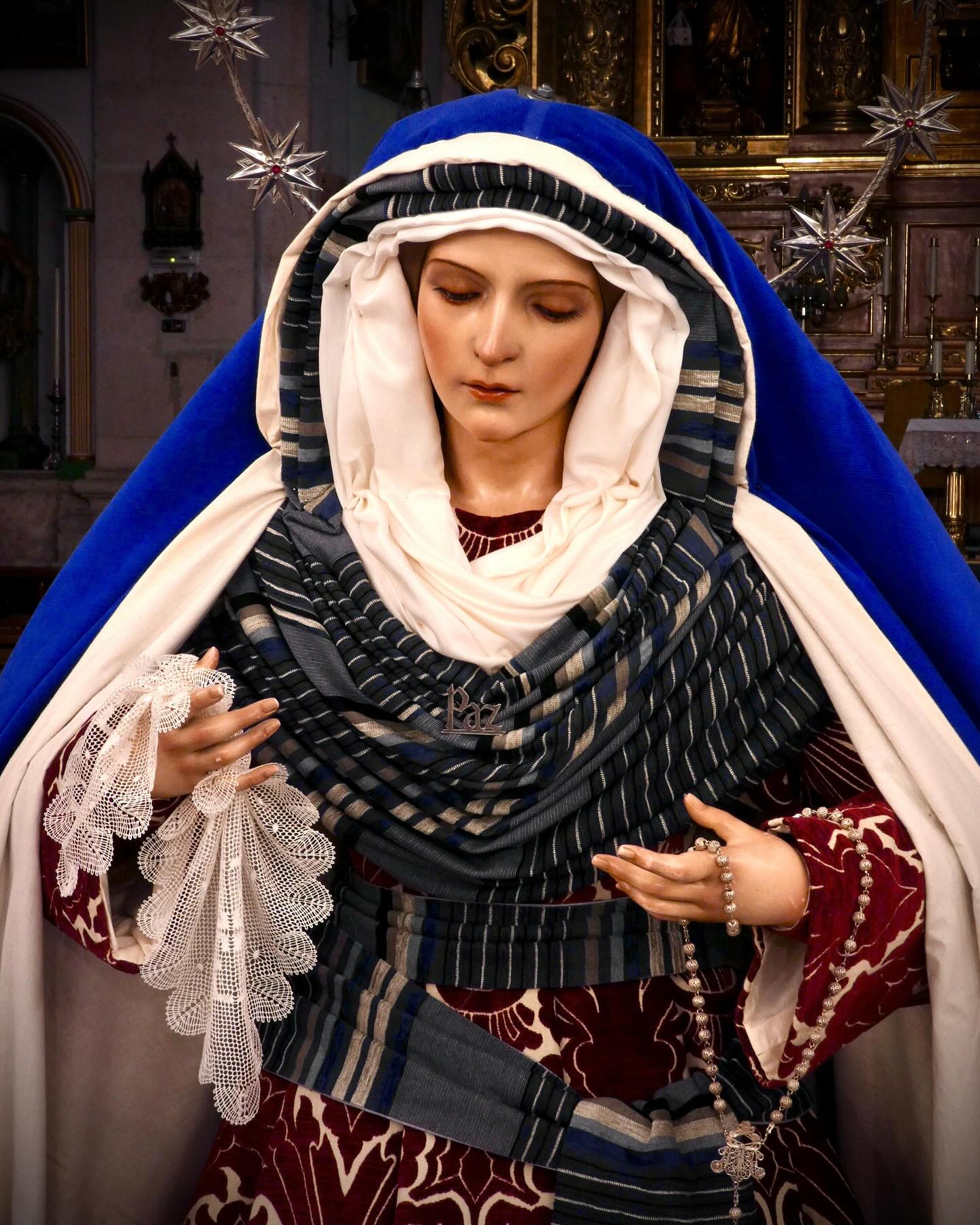 Hábito: Túnica y capa blanca con antifaz azul claro y escudo bordado de la hermandad.