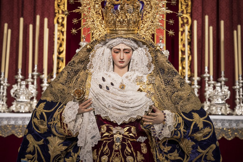 Hábito: Túnica y antifaz negro en los tramos de Cristo y túnica y capa blanca con antifaz negro en los de la Virgen.
