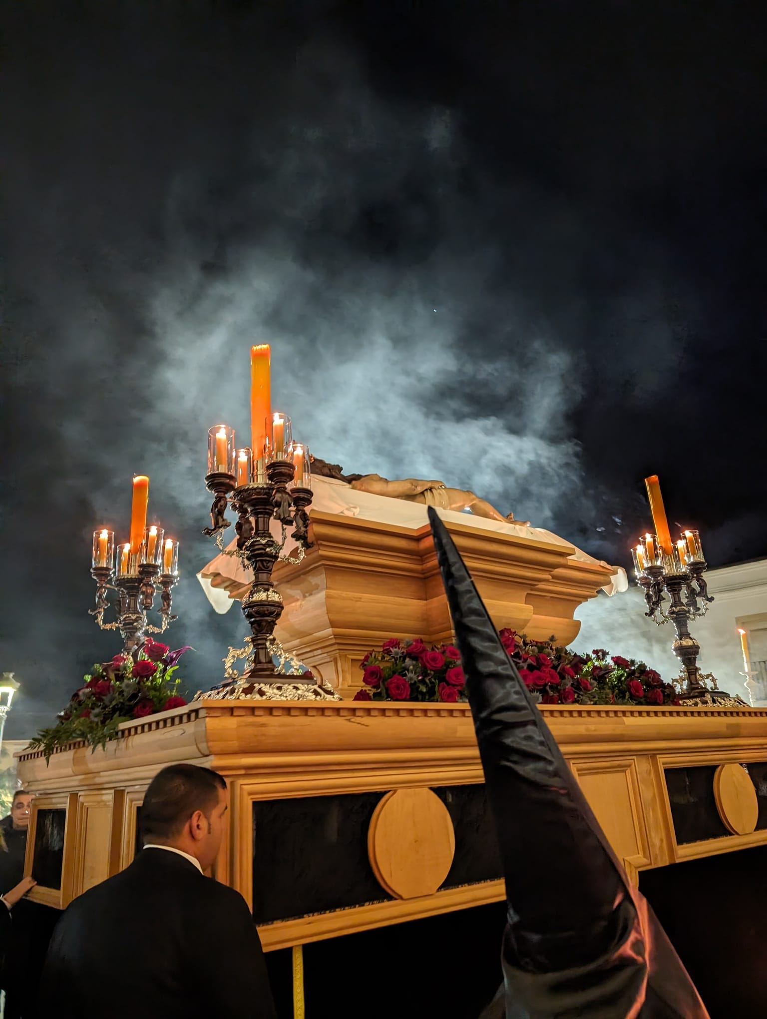 Hábito: Túnica, antifaz y capa de raso negro, con bocamangas de encaje blanco y fajín de esparto.
