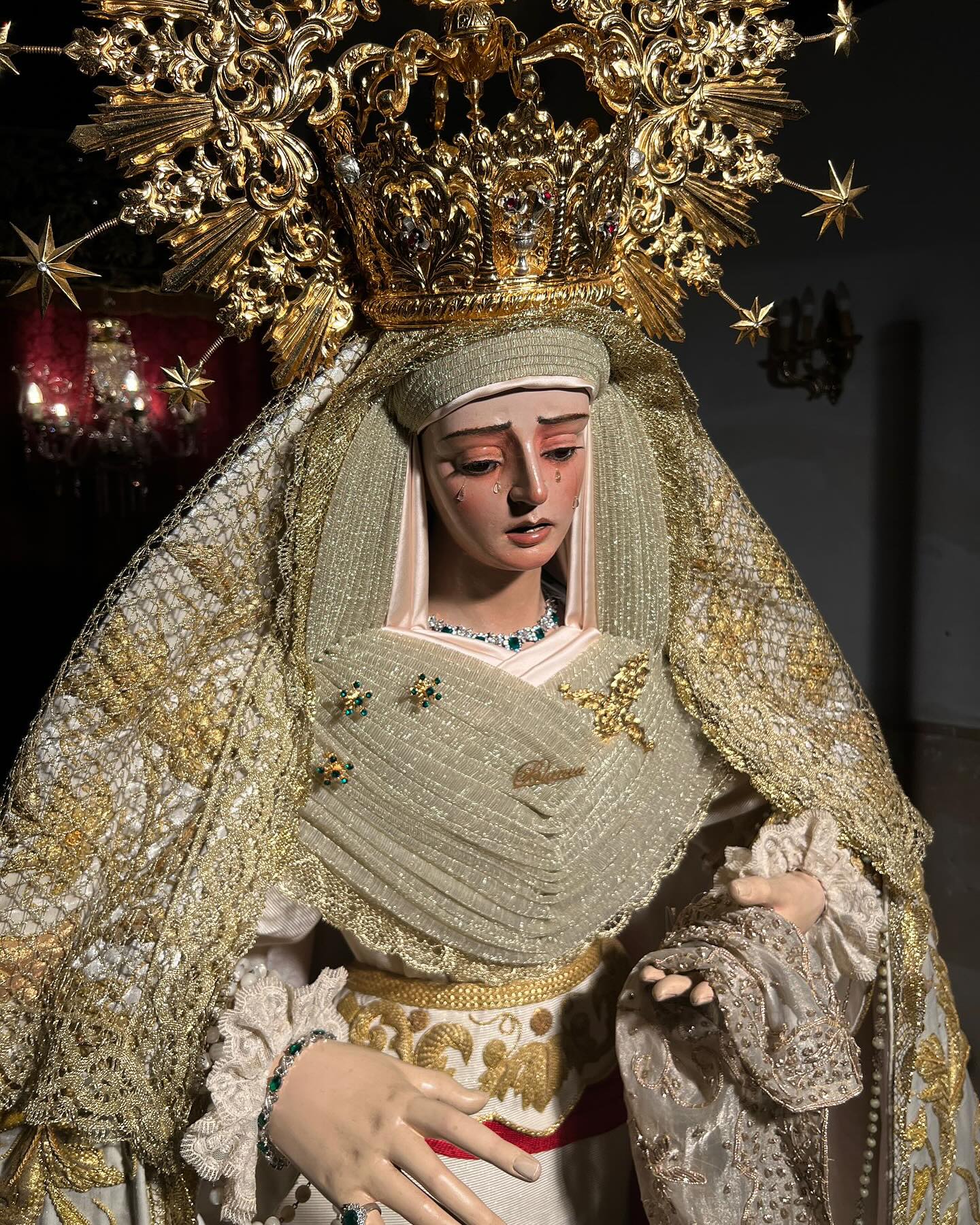 Hábito: Virgen: Túnica de sarga blanca con botonadura dorada, cíngulo rojo y capirote de terciopelo rojo Cristo: Túnica de terciopelo rojo con botonadura dorada, cíngulo blanco y capirote en raso blanco.