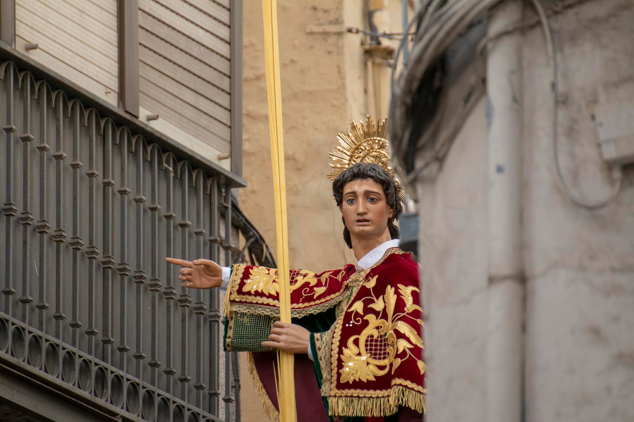 Hábito: Nazarenos de San Juan: Túnica y antifaz verdes, capa y cíngulo rojos. Portan palmas. Nazarenos de la Magdalena: Túnica y antifaz blancos, capa y cíngulo azules.