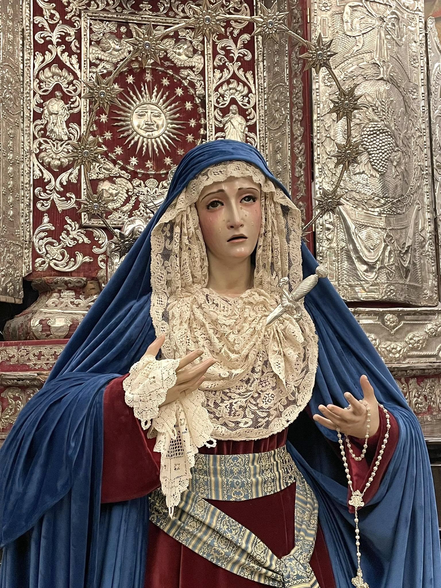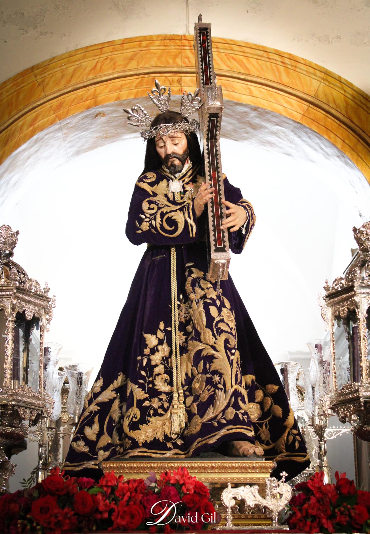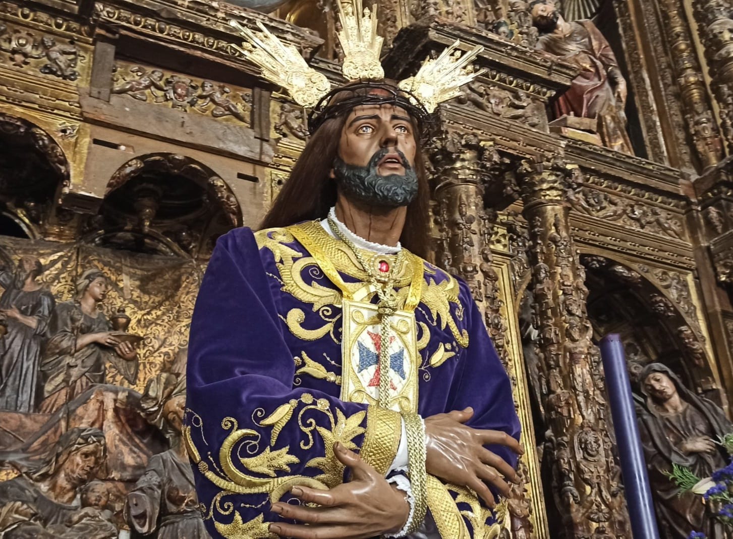 Hábito: Túnica lila de terciopelo bordada por un hermano, así como el guion