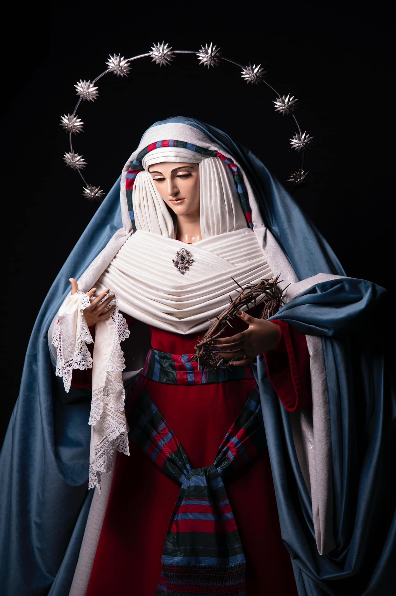 Hábito: Hábito blanco con capillo y cinturón azul, agarrando en la mano palmas y ramas de olivo