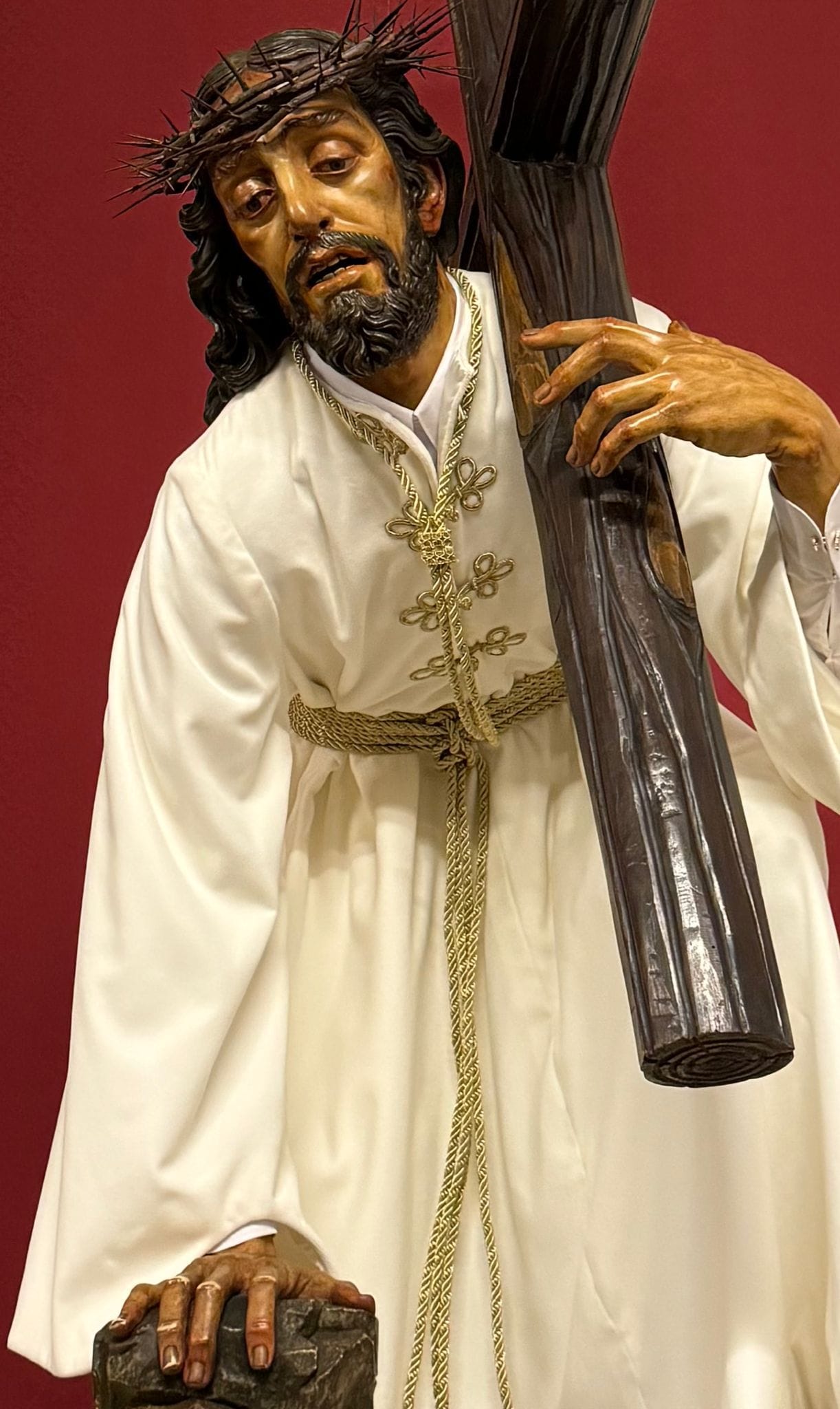 Hábito: Túnica burdeos, capillo blanco, capa blanca y cordón blanco.