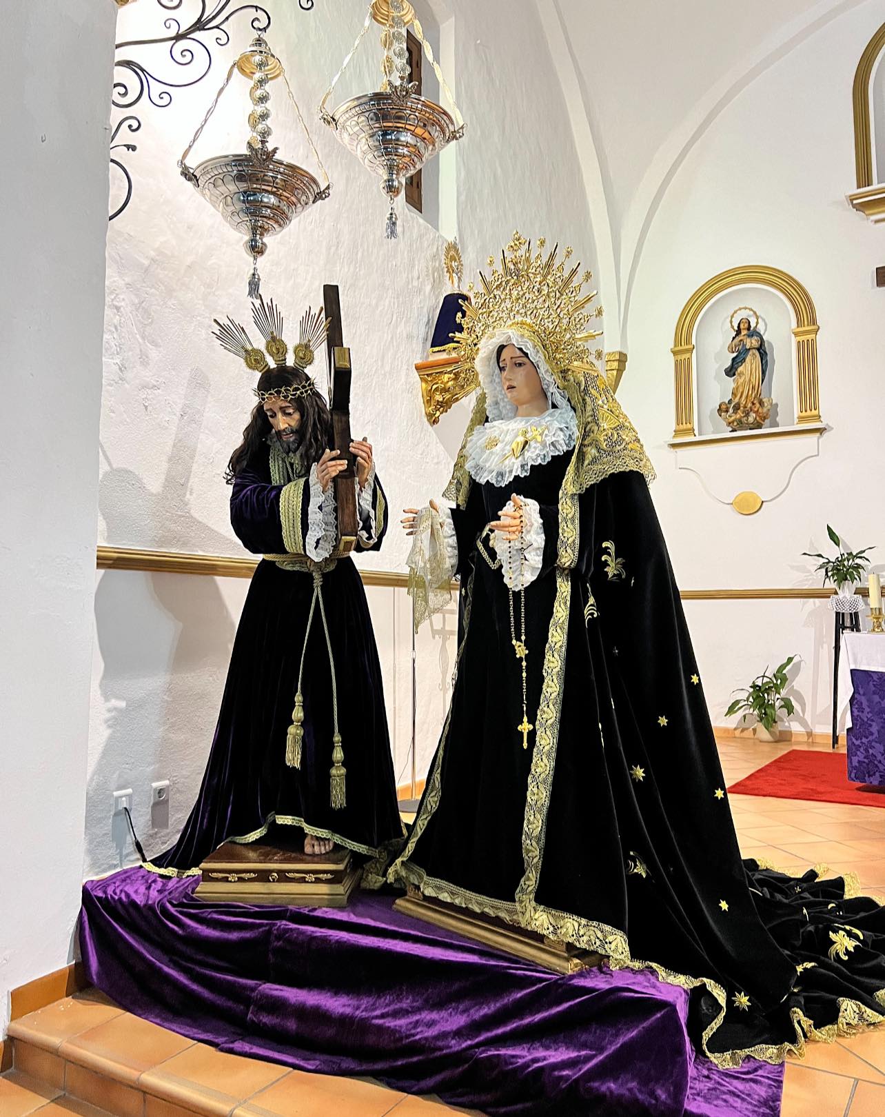 Hábito: Nazareno: Túnica de cola morada con antifaz morado y cíngulo de esparto. Dolores y Sepulcro: Túnica de cola negra con antifaz negro y cíngulo blanco. Mujeres de mantilla negra. Resucitado: Túnica de cola blanca con antifaz blanco y cíngulo de esparto.
