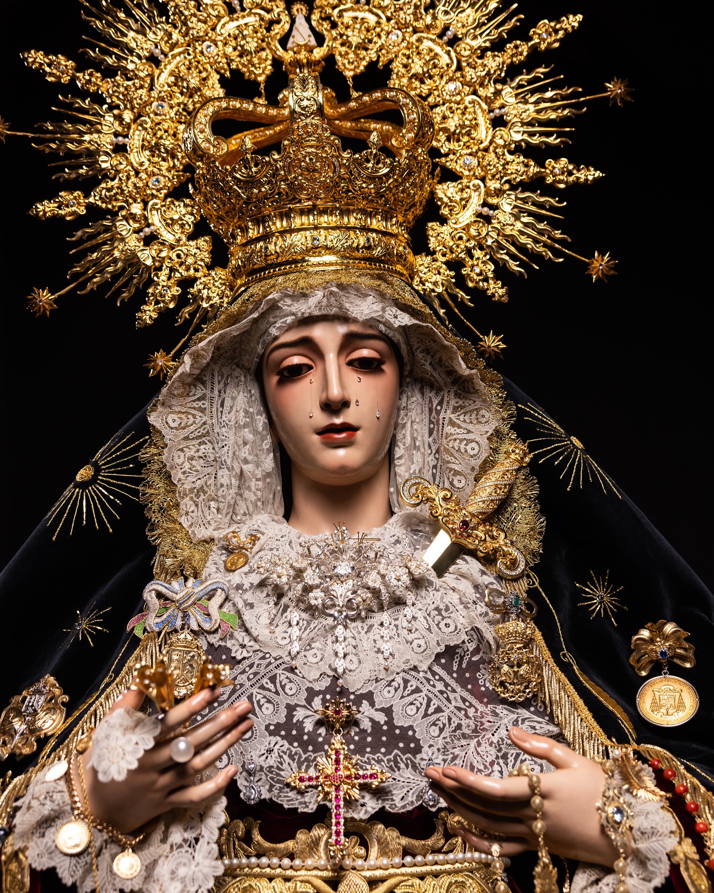 Hábito: Túnica negra de cola con antifaz y cíngulo burdeos. Mujeres de mantilla negra.