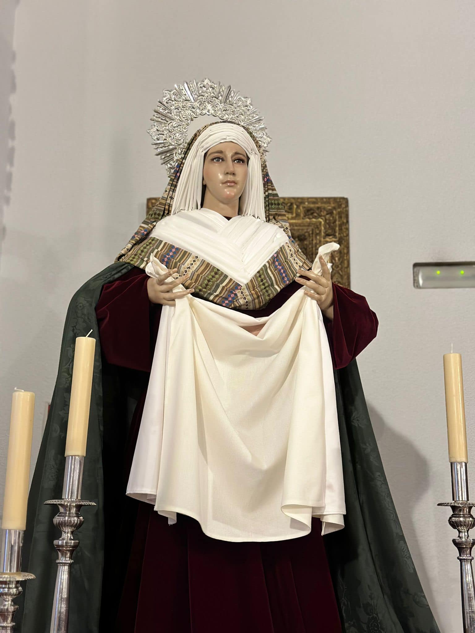 Hábito: Capa, túnica y cirio blanco en el tramo de la Virgen y cirio blanco en el tramo de Cristo, cubrerrostro y fajín granate, zapatillas negras de esparto, escudo en la capa.