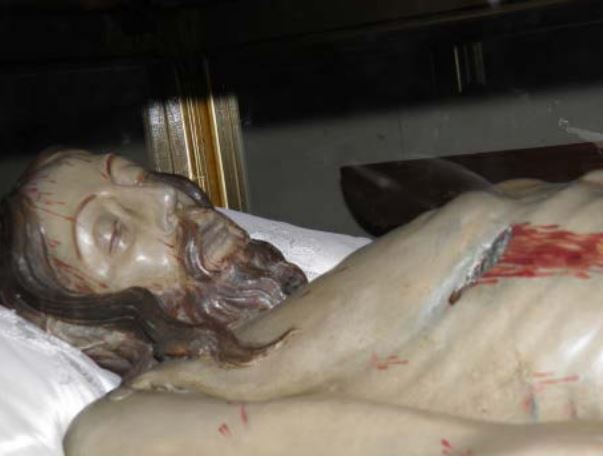 Hábito: Túnica de color sangre, cinturón de color negro, y capa de color blanca, con capirote de color también sangre.
